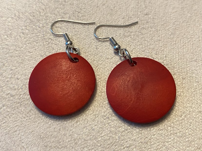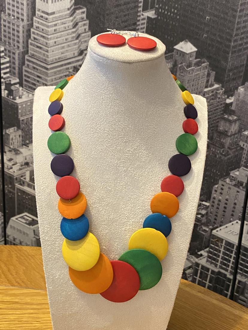 Colourful And Chunky Wooden Plate Necklace And Dangly Earring Set