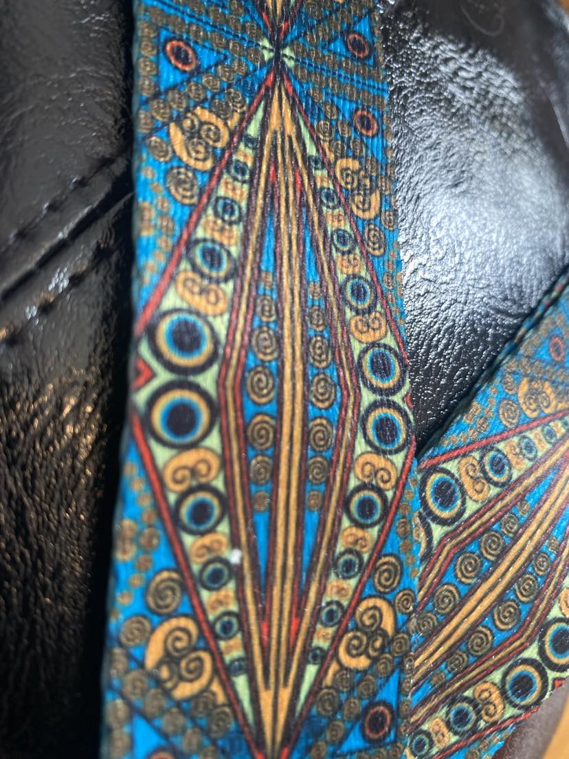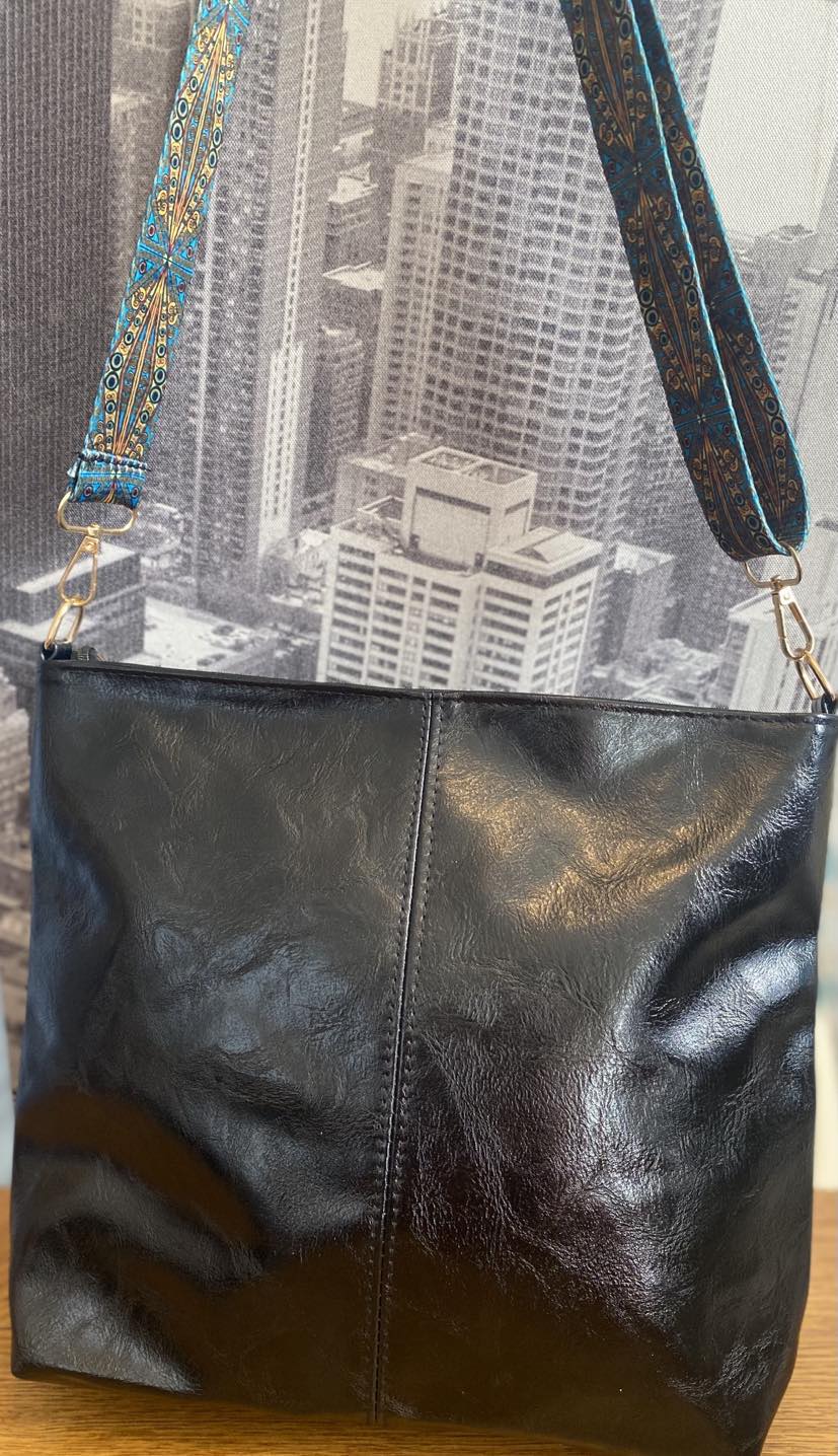 This leather look lined bag features a gorgeous geometric designed fabric adjustable strap. Be the envy of your friends with this stylish yet useful spacious bag with a zip fastening. Amazing value at an amazingly stylish price.