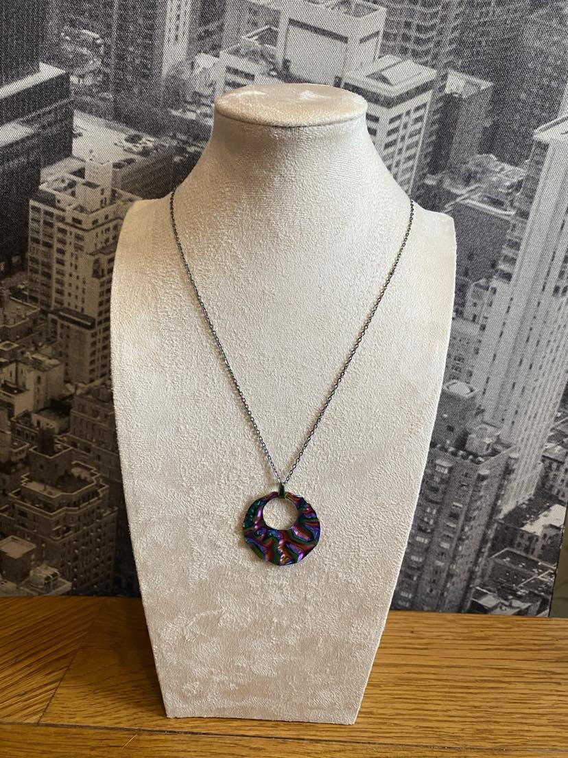 This gorgeous rainbow coloured necklace is a simple yet stunning round design with a crinkled effect on a pretty rainbow coloured chain. Perfect for adding a modern touch to any outfit.