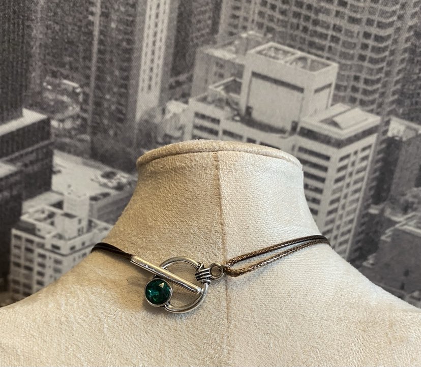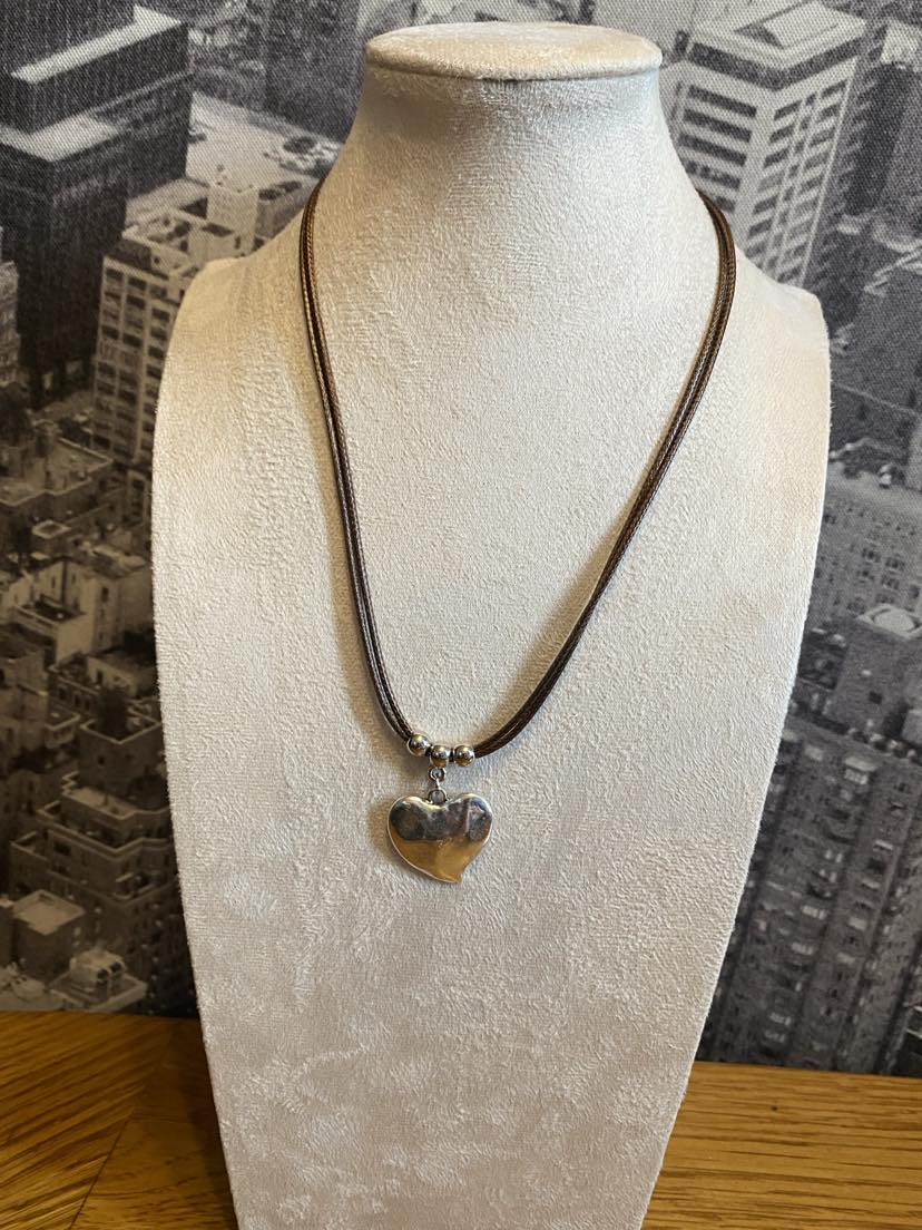 Simple Silver Heart On A Brown Cord With A Beautiful Clasp Featuring A Green Gemstone